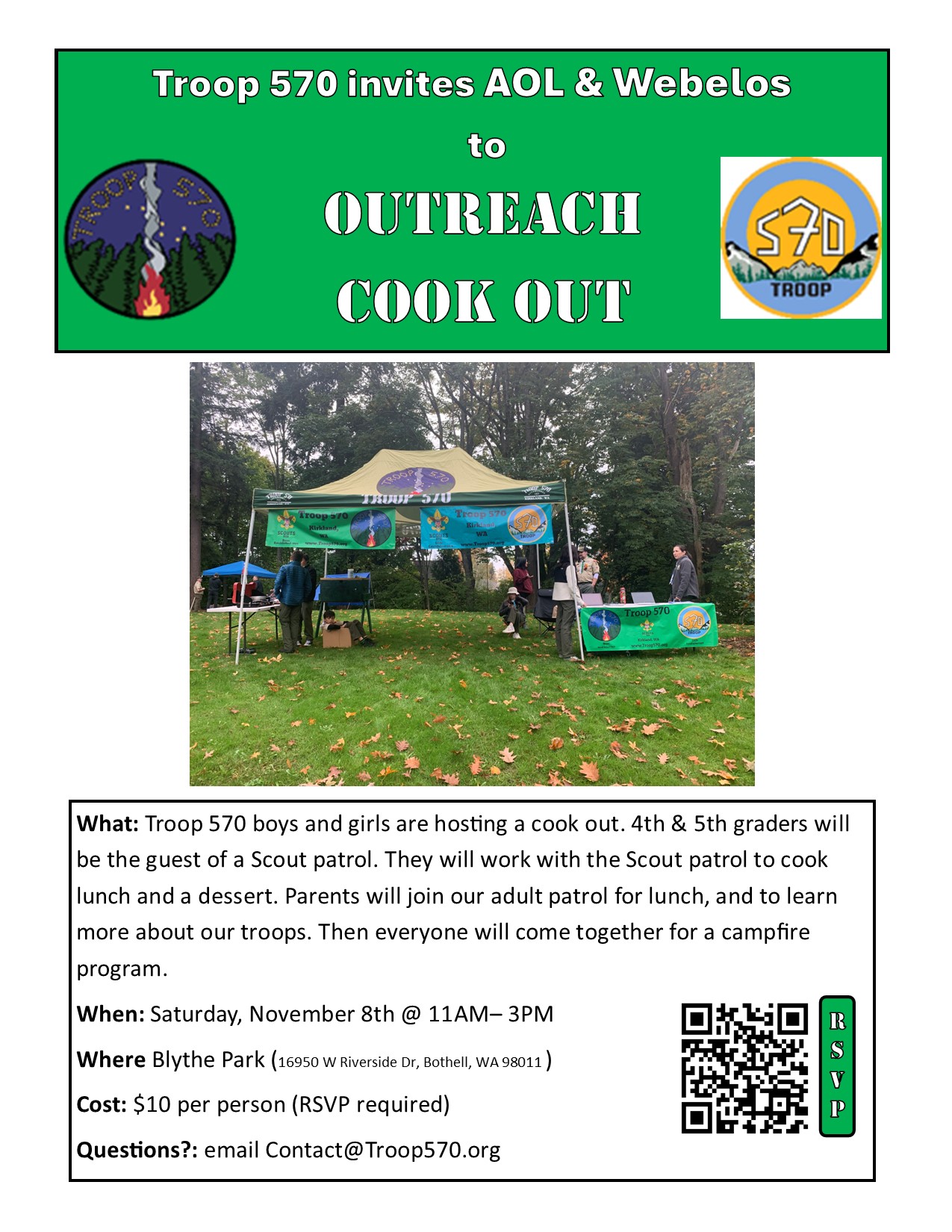 Troop 570 is hosting a special cook out on Saturday, November 8th from 11:00 AM – 3:00 PM at Blythe Park in Bothell.